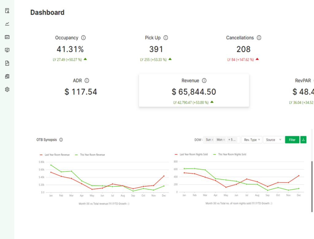 The dynamic dashboard offers a detailed and accurate overview of your business performance, presenting key metrics such as occupancy, revenue, ADR, and cancellations in an easy-to-read format. It provides clear comparisons between current and historical data through intuitive charts and numerical representations, allowing you to identify trends, track progress, and make data-driven decisions to optimize your revenue strategies.